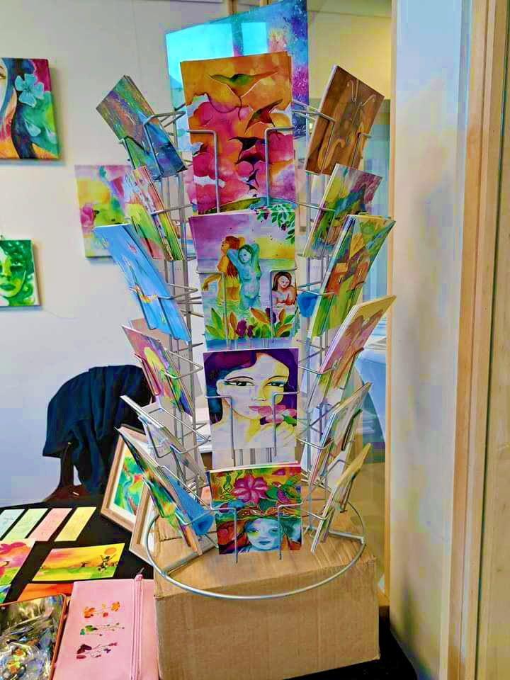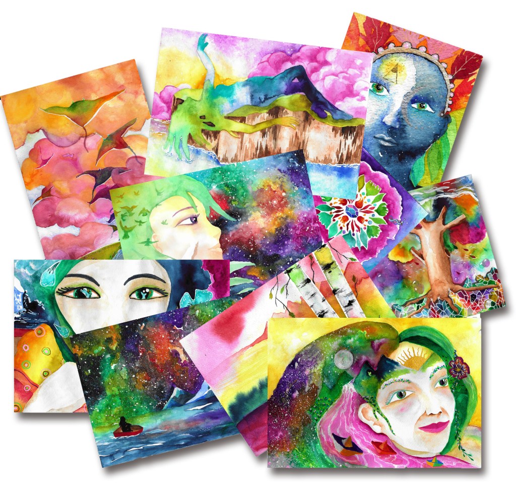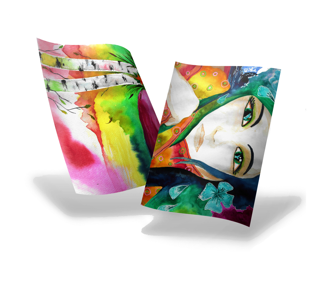 Cartes postales au choix – Format A6 (10x15cm) – papier 300 gr. – Recto brillant ou serti or – Verso inscriptible.
