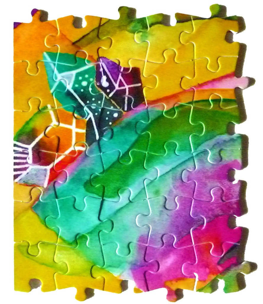 Puzzles aquarelles confectionnés sur une base en carton dur et recouverts d’une couche protectrice glossy.