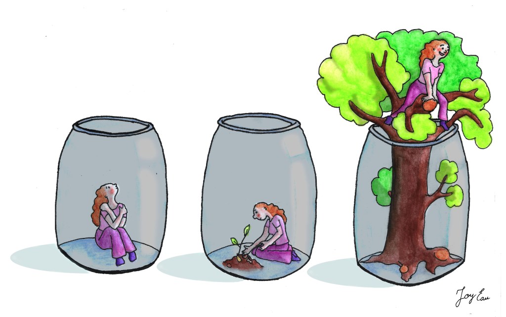 Nous t’aideront à sortir du bocal… Plante une graine, Occupe-toi régulièrement de la petite pousse qui apparaîtra, Bientôt cela sera un arbre Sur lequel tu pourra te hisser Pour sortir du bocal ! Et même, m’ont elles dit toutes rieuses, Une fois que tu seras sortie du bocal Tu verras alors que le bocal n’a jamais existé…