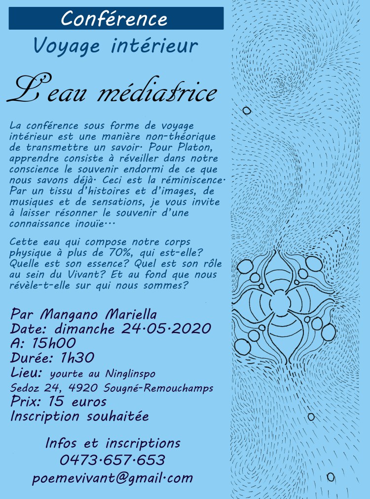 L’eau occupe une place vitale au sein de la création. Se mettre à l’écoute de son expression physique, sa manière unique d’être en lien avec l’ensemble du vivant nous donne une idée de sa nature et de ce qui lui importe en tant qu’être vivant. Etant composés à plus de 70% de cet élément, notre corps physique ne peut qu’en porter le caractère, la sensibilité et les potentiels… Découvririons en nous une nature humaine élargie éclairée par l’élément eau? Explorons !
