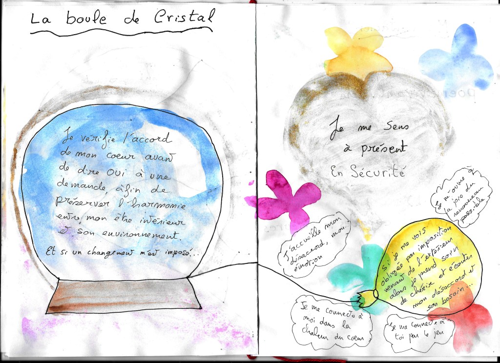 9. LA BOULE DE CRISTAL : dessinez un grand cercle, une boule de cristal représentant votre futur proche. Inscrivez 1 changement que vous voulez réaliser dans votre quotidien dans les jours ou semaines à venir. Ensuite représentez en couleur tout autour de la boule de cristal la sensation que vous ressentirez lorsque ce changement sera fait.