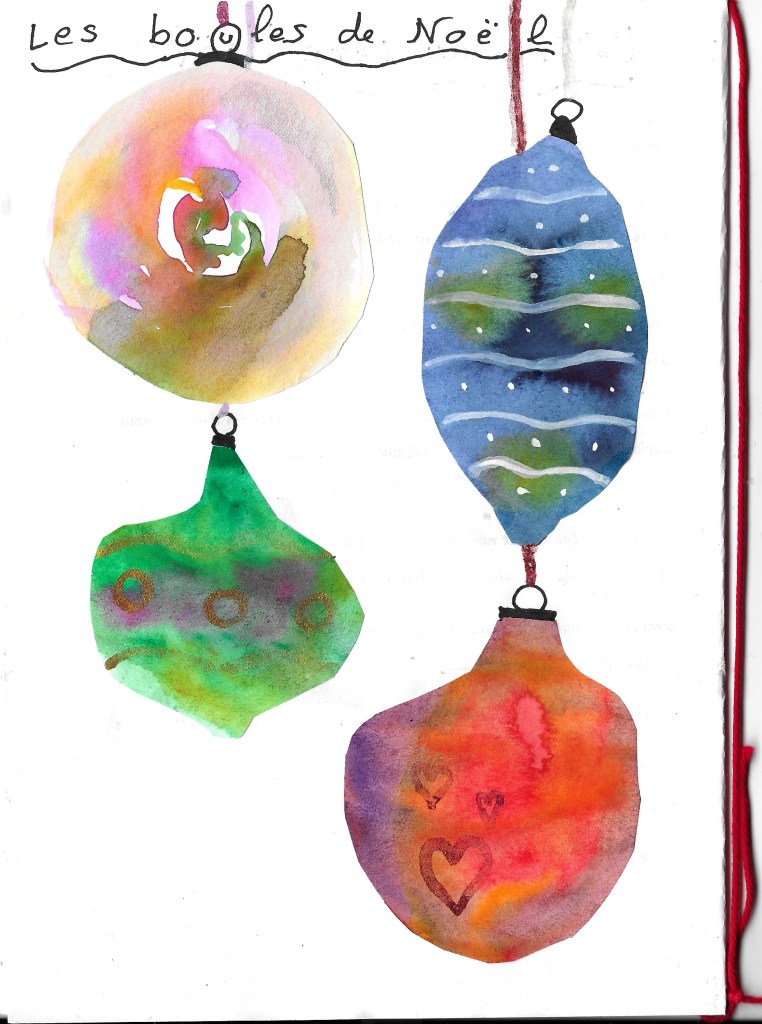 Prenez une feuille quelconque que vous allez remplir de couleur librement et à votre guise. Ensuite vous découperez cette feuille avec des formes de boules de Noel que vous collerez sur votre quatrième de couverture. Créez les attaches des boules, par exemple au bic ou avec du fil ou autre chose, faites appel à votre imagination sur base de ce dont vous disposez ! A vos créations….